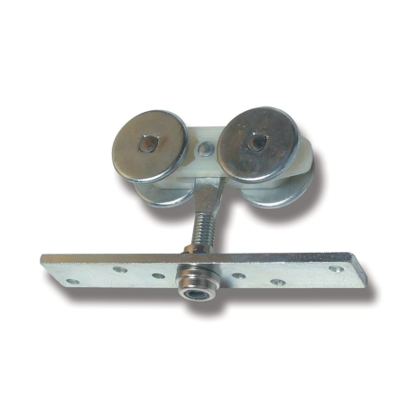 Hängrulle för trädörrar. Stålhjul max 150 kg per dörr. Infästningsplatta 25x140 mm. Passar till Henderson skena 290.