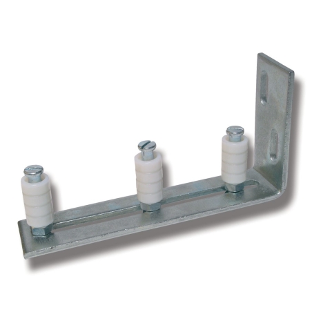 Väggstyrrulle Henderson för dubbla (omlottgående) portar. Vinkel av galvat stål med nylonrullar. Justerbar öppning mellan nylonrullarna.